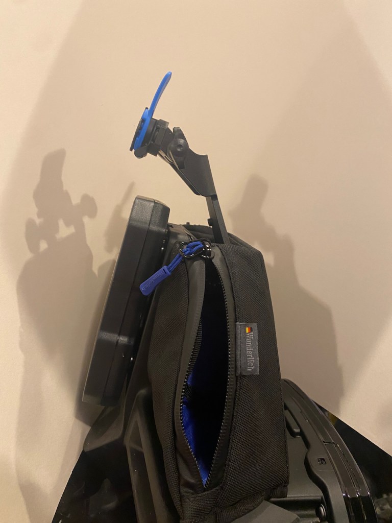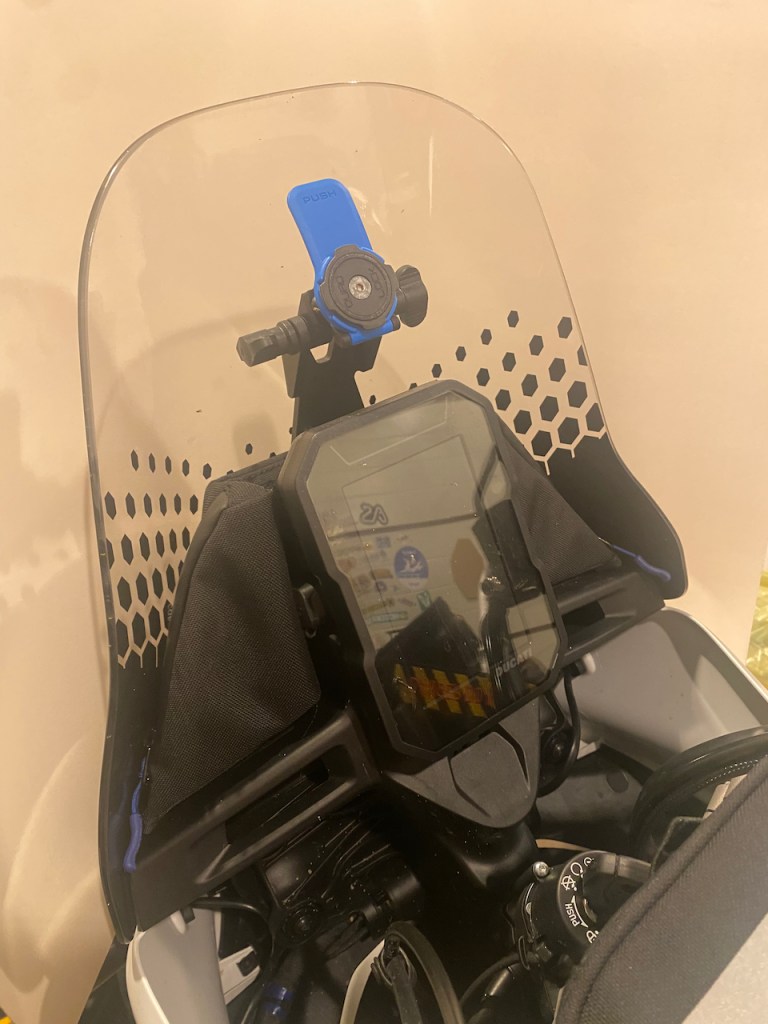 Another upgrade I installed comes from Wunderlich, too. They designed a cockpit bag that fits between the TFT display and the windscreen. I wasn’t sure if it would fit with the Evotech holder installed, and Wunderlich support wasn’t certain either. I ordered the bag and tried to install it, and it works completely fine. It’s pretty small, even smaller than it seems in promotional photos, but it fits keys, a spare iPhone cable, and a set of ROK Straps, and there is still some room there. A pleasant surprise is that they packed the bag into a reusable dry bag and included a balaclava as a gift.