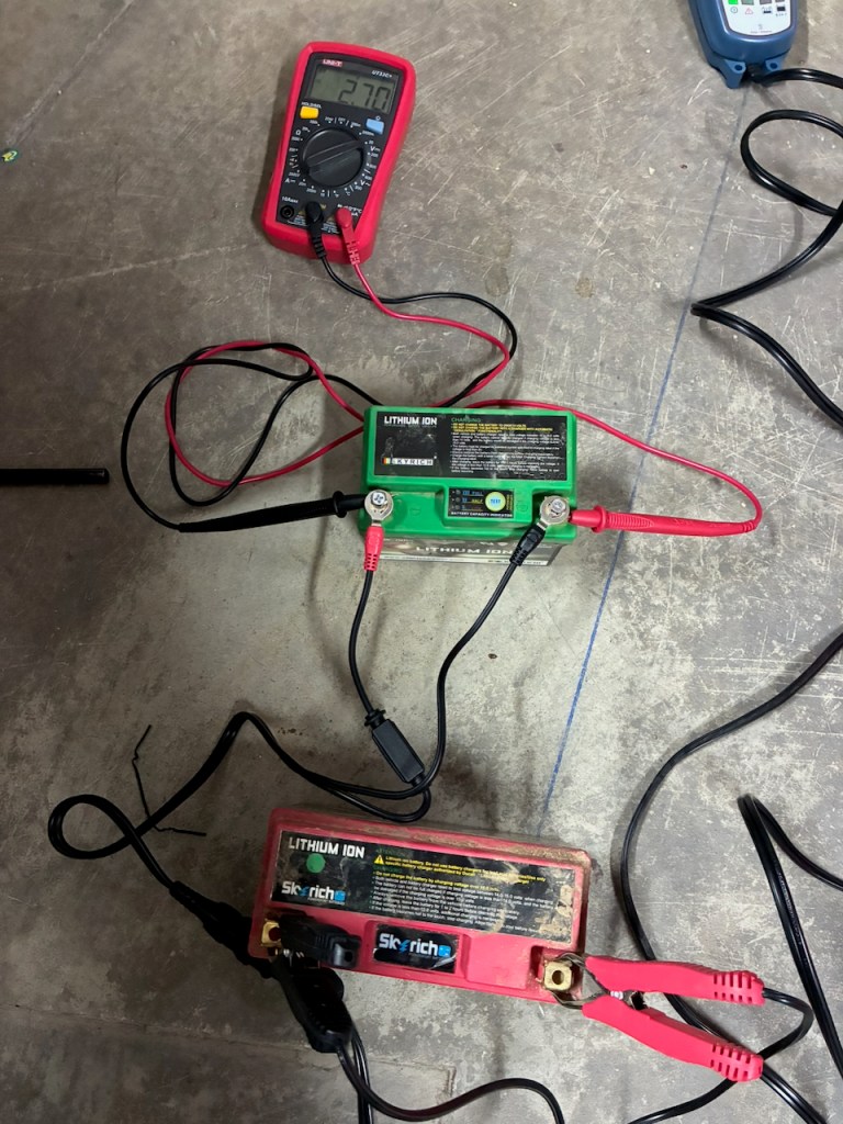 Later in the month, I wanted to go for an enduro ride on my KTM. Unfortunately, the battery died. My charger won’t even start charging the battery if it drops below 4V, so I tried charging it first with the DesertX battery. I know it’s not the best idea, but it worked. The battery rose to 4V, then the charger took over.